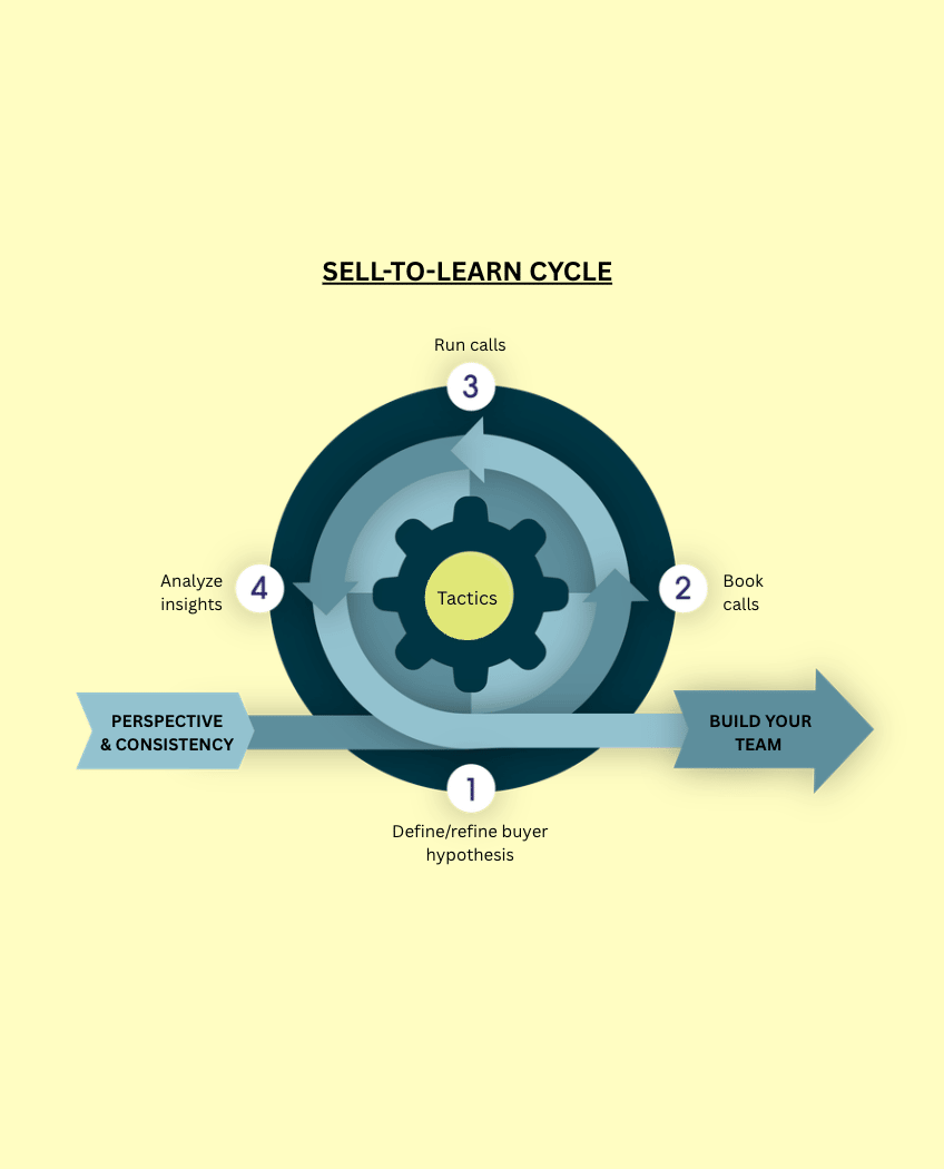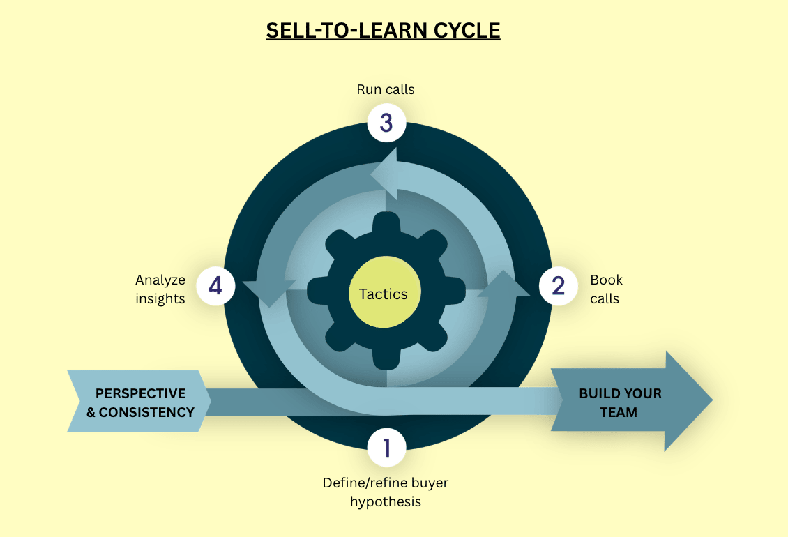 Finding product-market fit just isn’t linear. That’s why the process I use to find PMF isn’t linear either. Instead, it’s cyclical. You want to run cycles where you sell to one buyer type in order to learn. I call this process a sell-to-learn cycle.