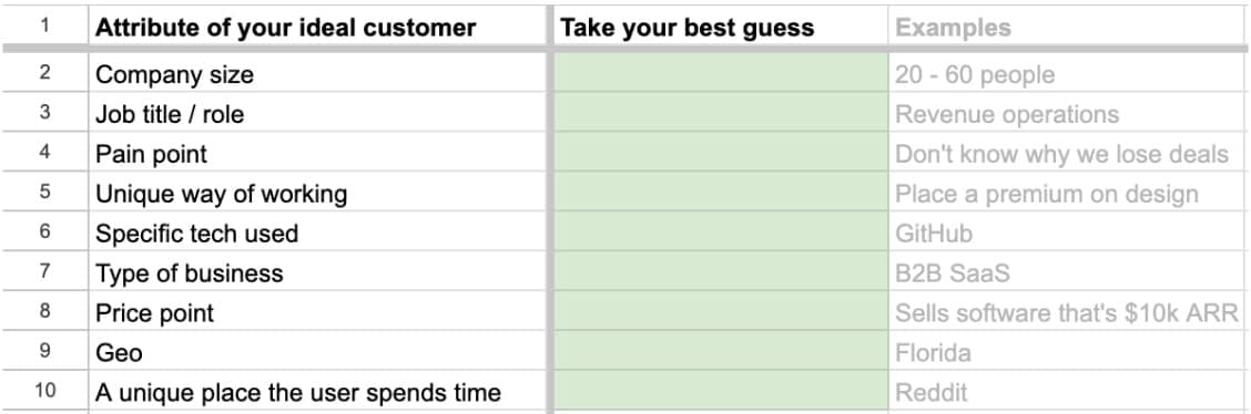 Fill out an ICP document that is primarily focused on firmographics (a company’s industry, headcount, location, etc.) and/or demographics.
